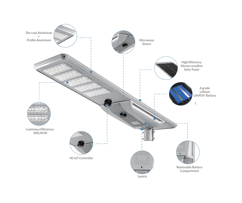 Stellar 1825SELD100 is a 100W all-in-one solar LED street light delivering 20000 lumens of brightness. Equipped with a 130W solar panel, IP65 weather rating, and support for pole heights up to 15m, it’s ideal for outdoor lighting in streets, warehouses, and commercial areas. Includes 3-year warranty.